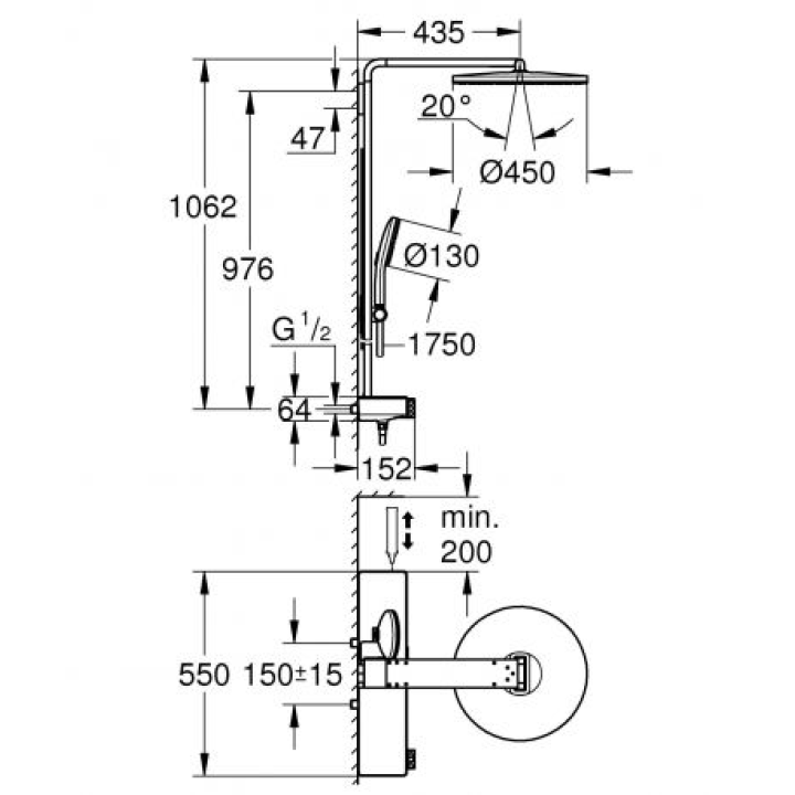 Комплектация: Ручная лейка, Верхний душ, Держатель для душа, Душевая штанга, Термостатический смеситель
